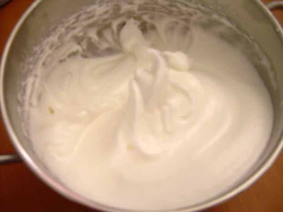 Intanto montare gli albumi a neve, quindi aggiungere lo zucchero pian piano continuando a sbattere, così otterremo una meringa ben soda.