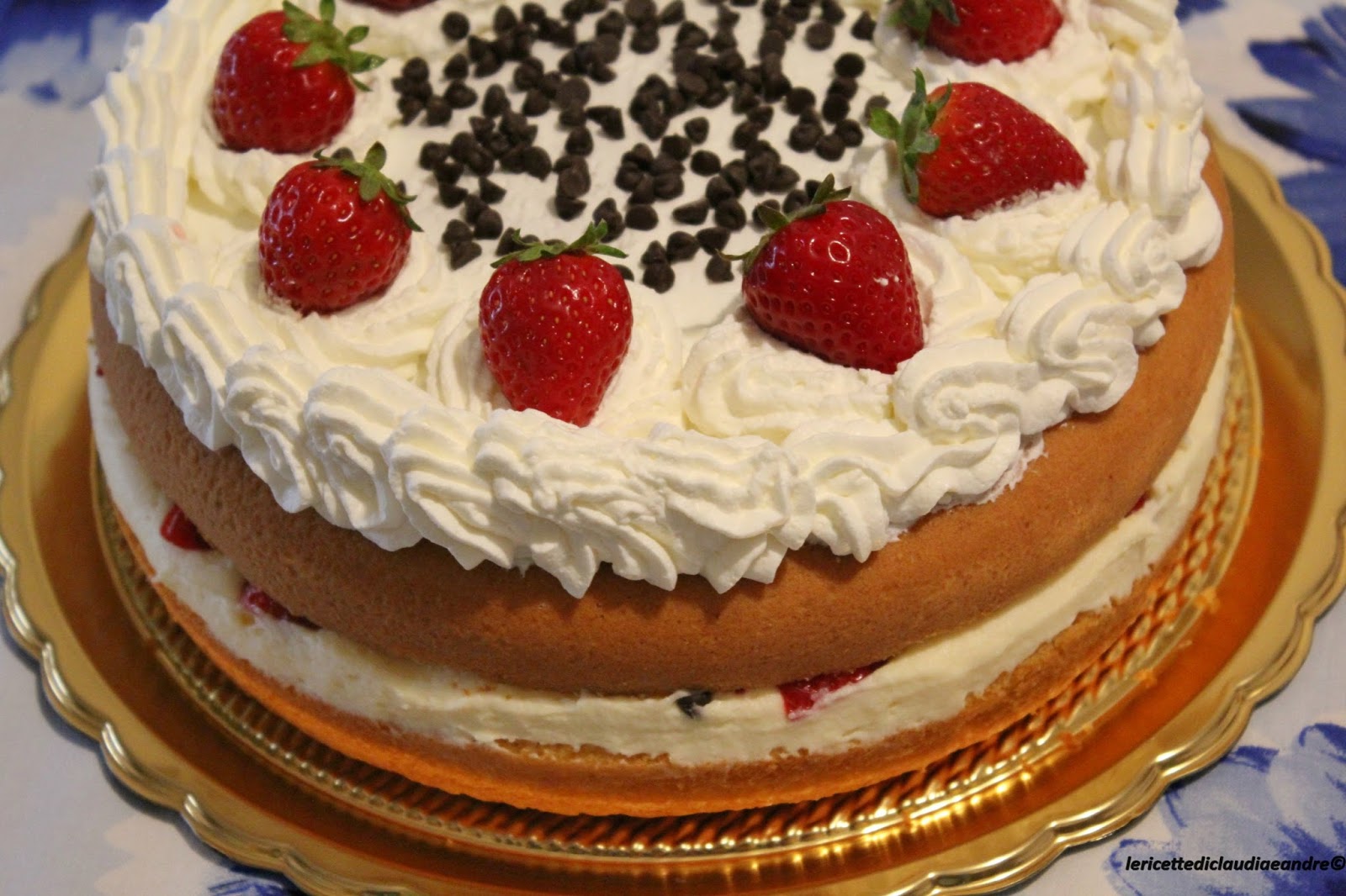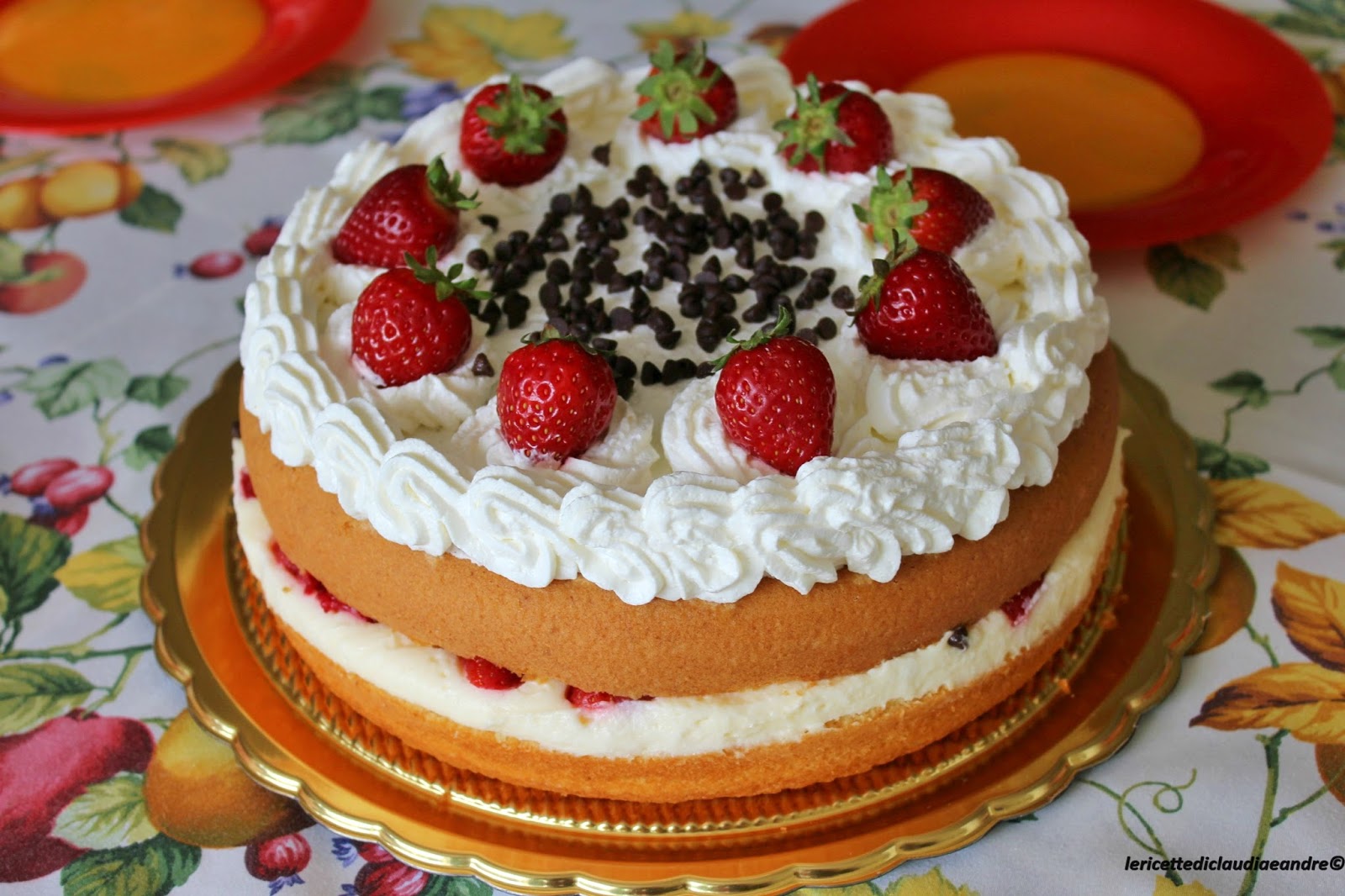 Torta soffice con crema chantilly, fragole e gocce di cioccolato
