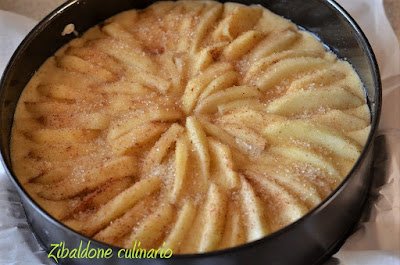 Imburrare ed infarinare uno stampo diametro 24 cm, versare l’impasto e disporre le mele a fette e cospargere con zucchero di canna. Infornare in forno preriscaldato a 180° per circa 40-45 minuti, dopo 30 minuti se si colora troppo potete coprirla con alluminio. Fare la prova stecchino prima di sfornare.