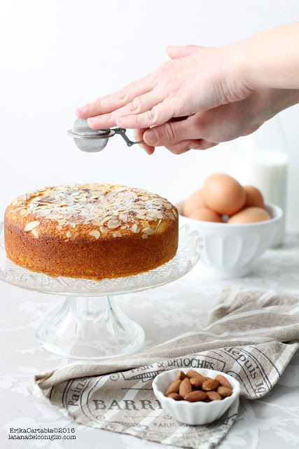 Imburrate e infarinate leggermente una tortiera, con fondo apribile, del diametro di 18-20 cm. Versate l’impasto e livellatelo bene. Disponete sulla superficie le mandorle a lamelle e fate cuocere in forno ben caldo a 180°C per 30 minuti circa.