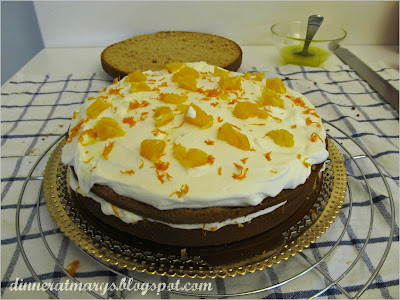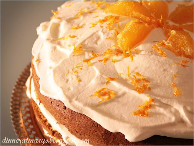 Dividete la torta in tre e iniziate a farcirla. Bagnate ogni strato con una bagna fatta di succo d’arancia spremuto fresco e il gran marnier, ricoprite ogni strato con un terzo di mousse all’arancia, con spicchi d’arancia e scorza d’arancia grattugiata.