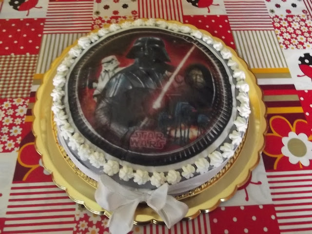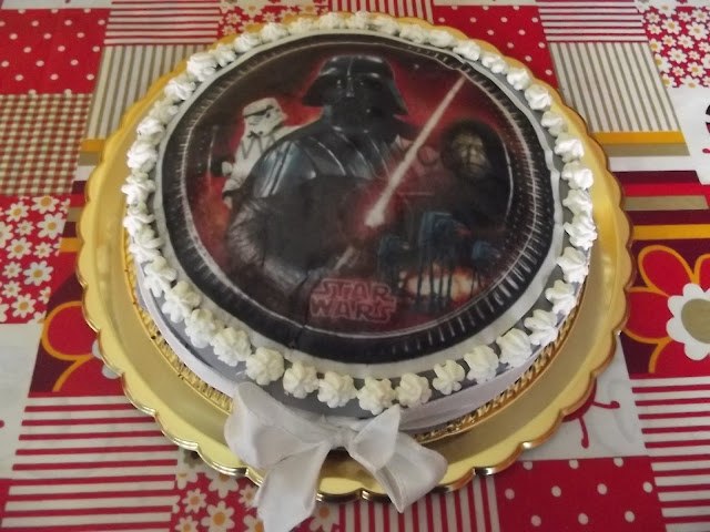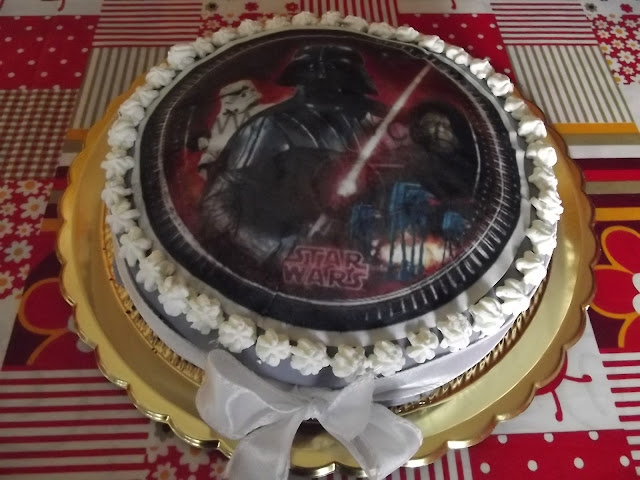Questa e’ la torta che ho preparato per la sua festa, con la base al cioccolato sprint, farcita con panna al caffe’ e decorata con pasta di zucchero, la cialda di star wars attaccata sulla pasta di zucchero con acqua e fiocchetti di panna intorno.