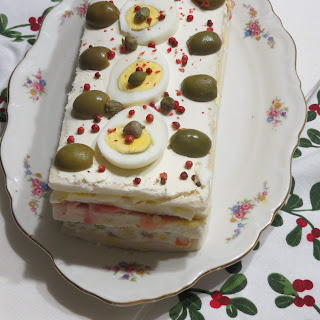 Decorate la superficie della torta tramezzino con l’uovo tenuto da parte dopo averlo tagliato a fette, qualche cappero, olive verdi e grani di pepe rosa. Lasciate riposare in frigorifero fino al momento di servirla. La torta tramezzino con prosciutto cotto e insalata russa è pronta per essere tagliata a fette e portata in tavola.