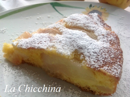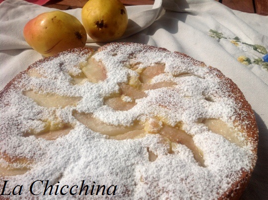 Pelare e tagliare a fette sottili le pere, imburrare ed infarinare una teglia con diametro ventiquattro centimetri: versarvi dunque l’impasto e disporre le fettine di mela a raggera.