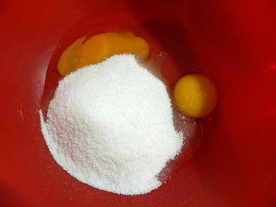 In un’ampia ciotola mescolare le uova con lo zucchero