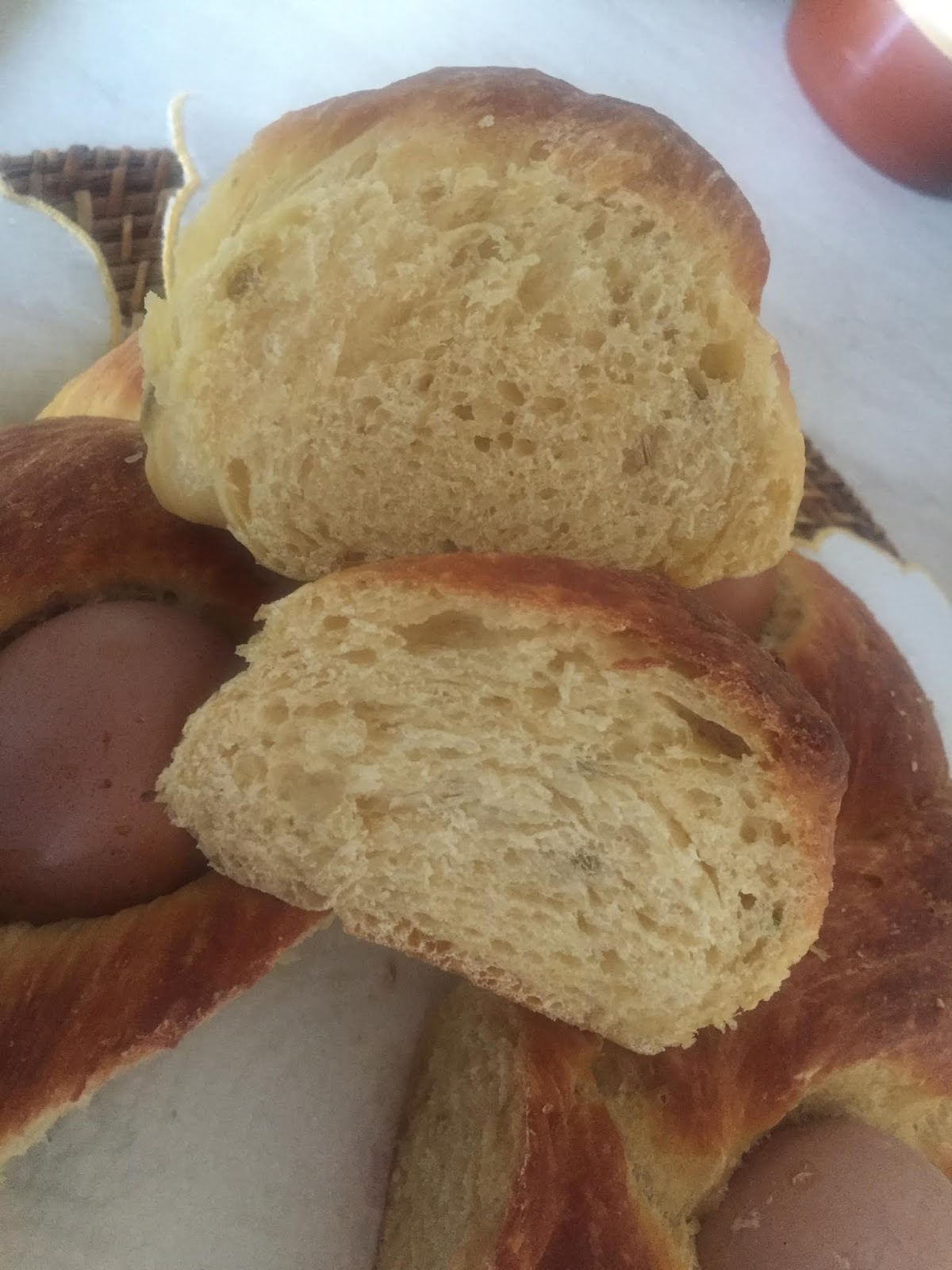 Versate in una ciotola la farina con i semi di finocchio e miscelate bene. Di seguito aggiungete il lievito sciolto in mezzo bicchiere di acqua tiepida, le uova leggermente sbattute con il sale e l’olio. Lavorate fino ad ottenere un impasto compatto ed elastico. Fate lievitare fino al raddoppio ( io nel forno per tre ore circa). Trascorso questo tempo con la pasta lievitata formate due cordoni uguali, intrecciateli e poi formate una ciambella. Disponete le uova tra gli incavi e fate lievitare nuovamente in una tortiera foderata con carta forno.