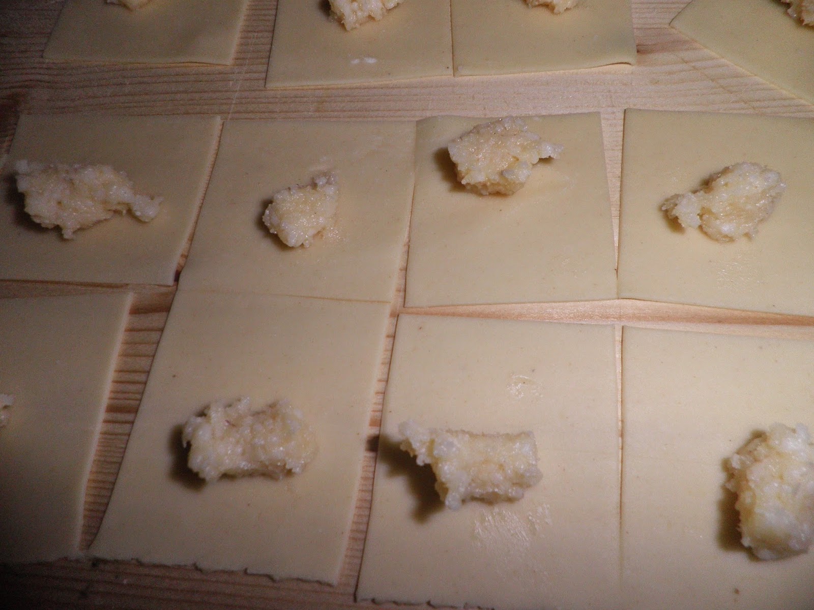 Stendete la sfoglia sottilissima, tagliate a quadratini e distribuite il ripieno.