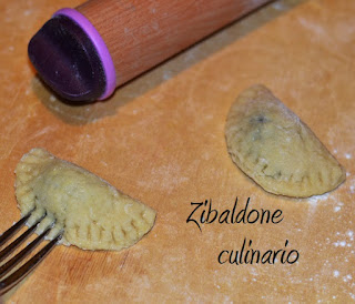 Togliere dal frigo l’impasto e con l’aiuto di mattarello tirare una sfoglia di 2 mm, aiutandosi con la farina per evitare che si attacchi alla tavola in legno, tagliare dei cerchi, con un coppapasta o un bicchiere, mettere una noce di ripieno, richiudere e assicurare la chiusura con i rebbi della forchetta.