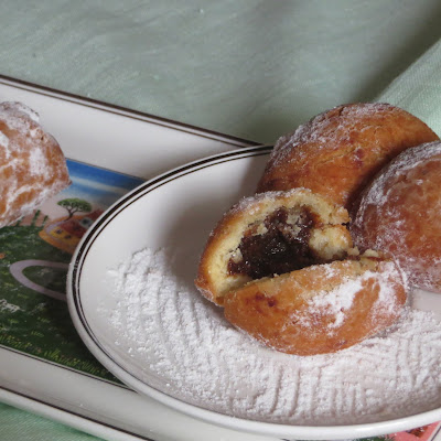 Sulla spianatoia unire tutti gli ingredienti, tranne il latte che terrete a parte, e impastateli velocemente. Potrebbe servire un cucchiaio di latte in più o in meno per raggiungere l’impasto desiderato. Avvolgetelo con la pellicola trasparente e lasciate riposare in frigorifero per un’ora. Sulla spianatoia spolverata di farina stendete la pasta a strisce abbastanza larghe. Farcirle con un cucchiaio di marmellata, (come si farciscono i ravioli) e sigillate con un coppapasta di piccole dimensioni. Friggete in abbondante olio di arachidi caldo, scolarle e spolverate con abbondante zucchero a velo.