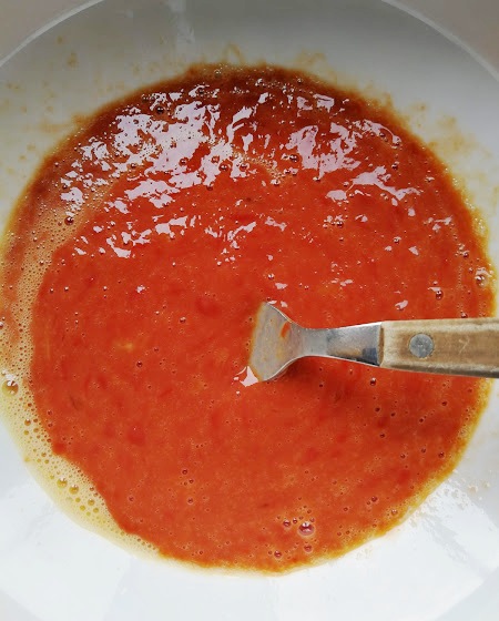Mescolare in una scodellina le uova sbattute con il concentrato di pomodoro.