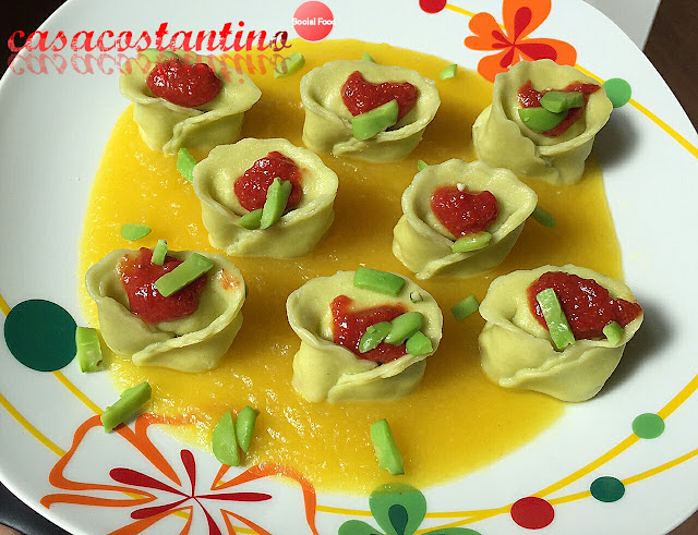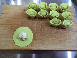 Al centro di ogni disco posizionate un cucchiaino abbondante di ripieno, poi spennellate tutto attorno con un po’ d’acqua e ripiegate il disco a metà, facendo aderire bene in modo che tutta l’aria esca fuori. Abbiamo così un mezzo disco ripieno. Prendete i 2 spigoli che si sono venuti a creare e piegateli uno verso l’altro accavallandoli, bagnando uno spigolo con un po’ d’acqua per farli aderire, a questo punto non resta che ripiegare leggermente indietro la parte superiore e avrete ottenuto i vostri tortelloni! Cuoceteli in abbondante acqua salata per 2-3′, poi prelevateli con una schiumarola ed adagiateli su un foglio di carta assorbente per eliminare l’acqua in eccesso, ora siete pronti per impiattare!