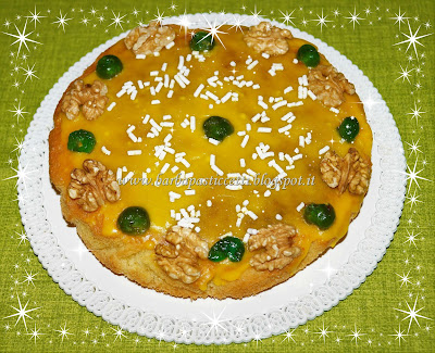 Decorare subito con noci, ciliegie candite e zucchero in granella altrimenti se si indugia troppo, la glassa si asciugherà velocemente e le decorazioni non si attaccheranno.