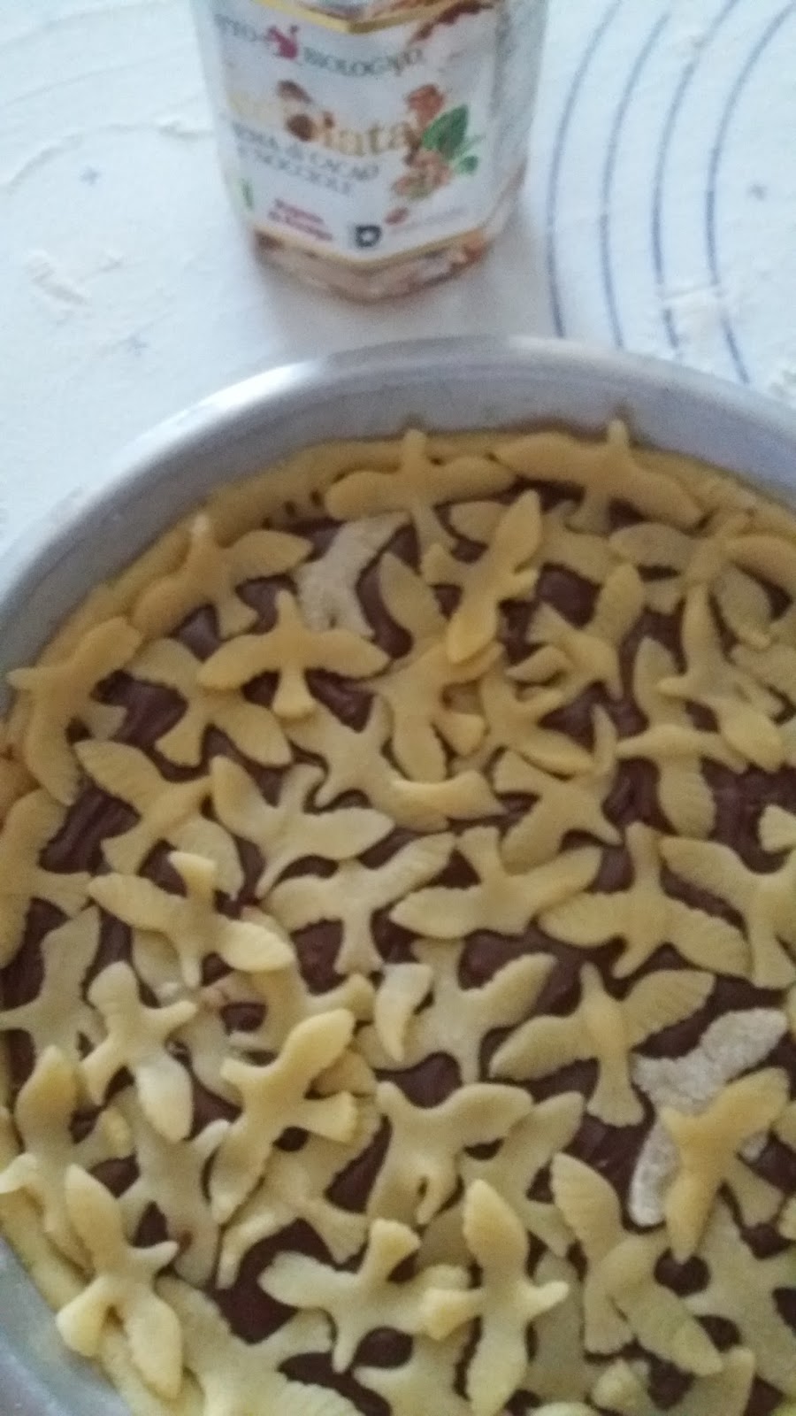 con nocciolata,ricoprire poi con piccoli decori della restante frolla ,fatti con stampini a forma di colomba.