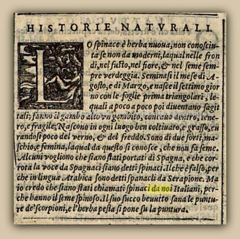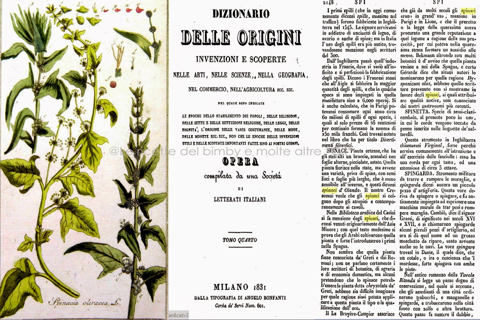 Il medico bolognese Baldassarre Pisanelli già nel 1583 scrive, nel suo “Trattato de’ cibi et del bere”, di un’ “erba nuova”, ovvero sconosciuta agli antichi. La coltivazione degli spinaci in Italia può esser ricondotta al XIII-XIV secolo. La loro diffusione però divenne più ampia nelle cucine europee e americane solo verso la fine dell’800.