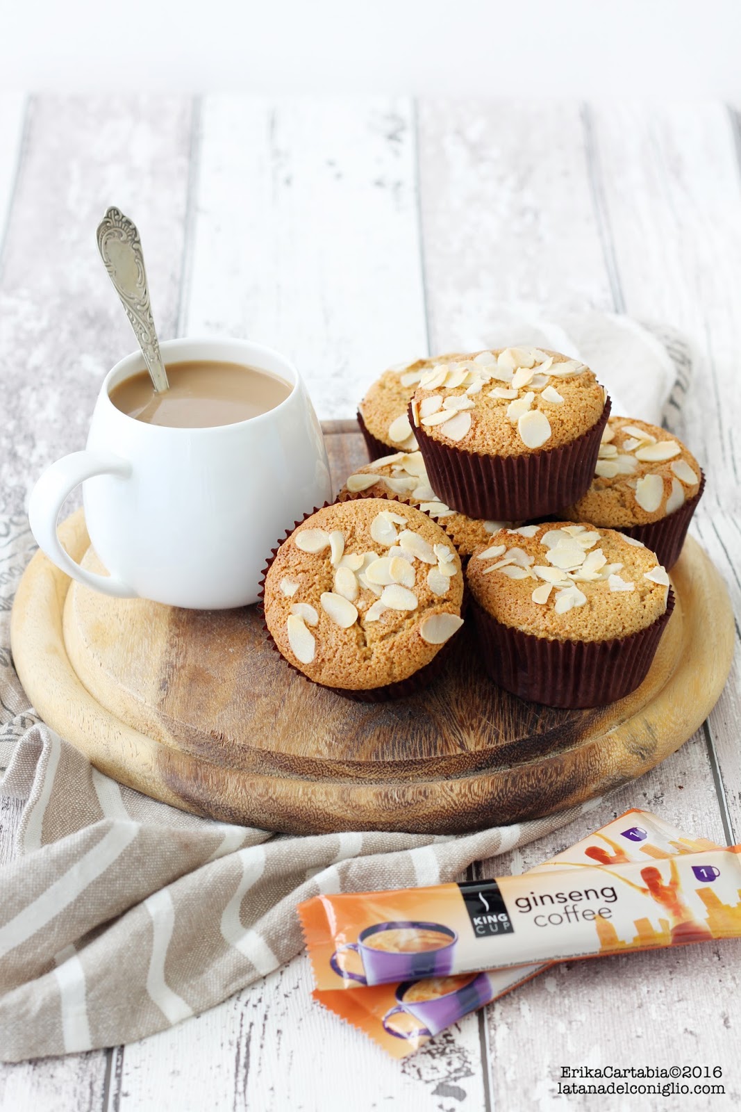 Qui sono sparite in pochissimo tempo e sono piaciute davvero a tutti. Il gusto del caffè al ginseng è delicato, l’impasto morbidissimo grazie alla farina di mandorle, naturalmente senza glutine. Mi sono tuffata un po’ ad occhi chiusi in questo esperimento azzardando anche con una farina che sto imparando a conoscere e ad amare alla pazzia, quella di amaranto, scovata qualche settimana fa da Naturasì.