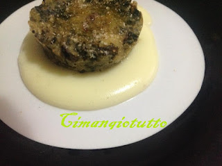 Versare la crema sui piatti, quindi adagiarvi i tortini di cicoria.