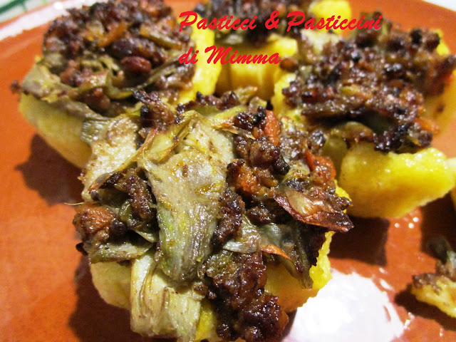 - in ogni pirottino inserire due cucchiai di polenta, qualche pezzettino di formaggio e 1 cucchiaio abbondante di ragu’ con i carciofi