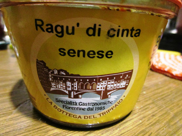 Ho provato il ragu’ di Cinta senese, una varietà di suino tipico della zona di Siena. Buonissimo, profumato e gustoso come se lo avessi preparato in quel momento!!!! ho aggiunto un avanzo di cuori di carciofo trifolati e qualche pezzetto di provola dolce semistagionata e….A TAVOLAAAA!!!!