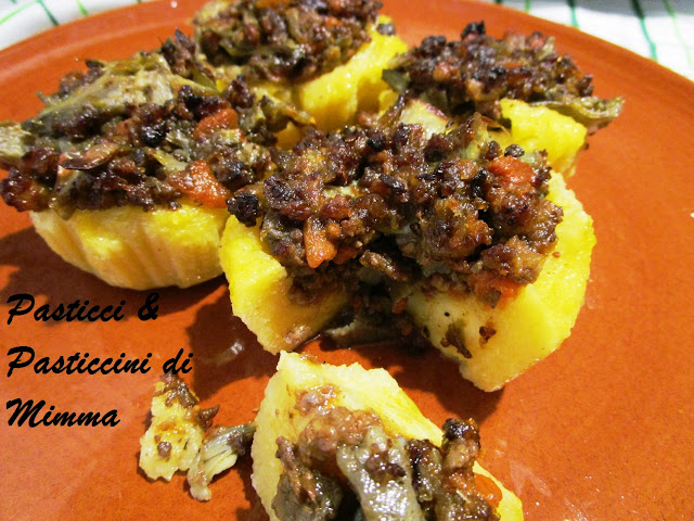 - in ogni pirottino inserire due cucchiai di polenta, qualche pezzettino di formaggio e 1 cucchiaio abbondante di ragu’ con i carciofi