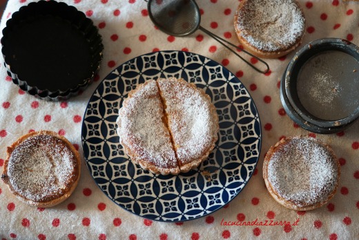 - Imburrate ogni stampo, disponete il disco di frolla avendo cura di farlo aderire bene in ogni angolo, versate la crema di riso e infornate 180°C per 25-30 minuti. Lasciate in forno spento 5 minuti a rassodare