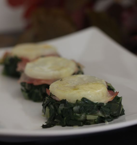 Ponete nello stampo da muffin prima un po’ di Sbrinz grattugiato, poi il dischetto di sedano rapa, in seguito il prosciutto e infine gli spinaci. Fate asciugare in forno per qualche minuto.