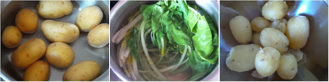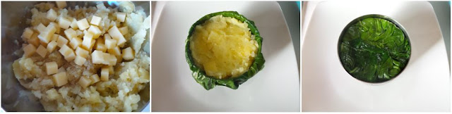 Schiacciamo le patate con una forchetta, condiamo con sale e pepe quindi aggiungiamo la fontina tagliata a dadini, mescoliamo e mettiamo da parte. Adagiamo al centro del piatto un coppapasta, iniziamo a disporre tutto attorno le foglie di bieta lasciandole sbordare oltre lo stampo, riempiamo il coppapasta con con le patate quindi richiudiamo le biete in modo da sigillare il tortino. Possiamo completare il piatto e servire.