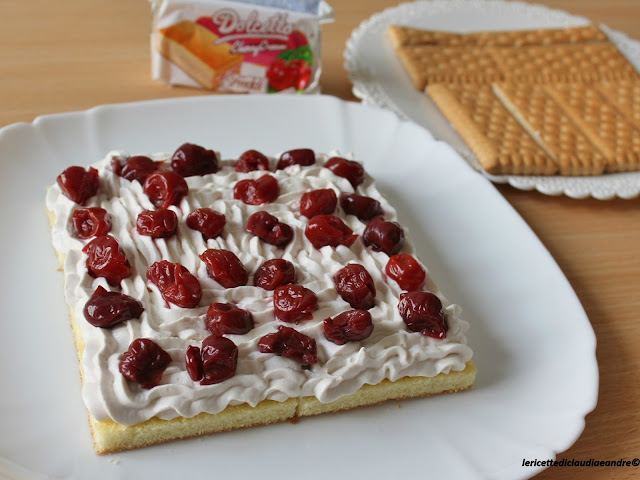 - Farcire con un strato di crema, amarene sciroppate a piacere e coprire con i biscotti tagliati della misura delle merendine.