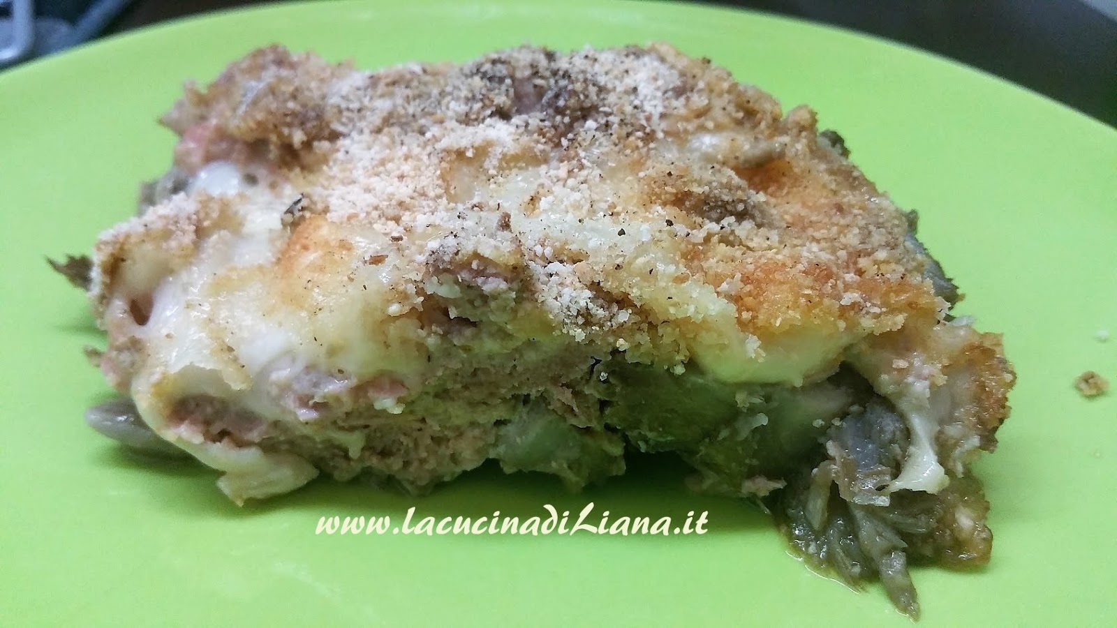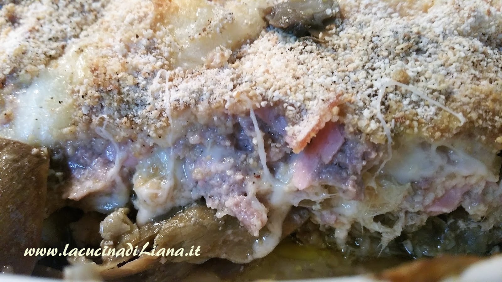 Ungere di olio una teglia, coprire con uno strato di carciofi, ricoprire con il composto di carne e formaggio, spolverizzare con pangrattato e infornare a 200 gradi per 30 minuti.