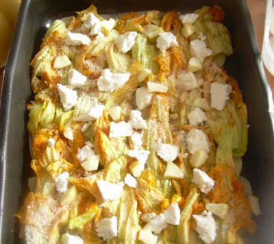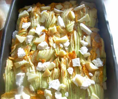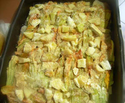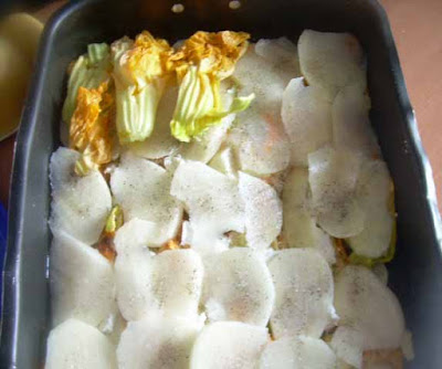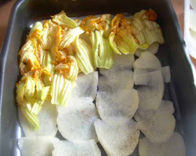 Oliare una teglia e formare uno strato di patate, salare, pepare e coprire le patate con uno strato di fiori di zucca,