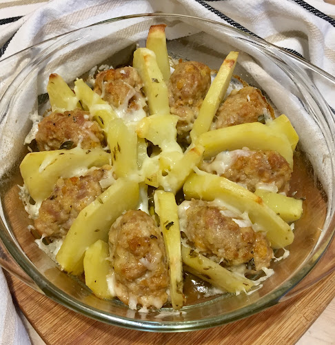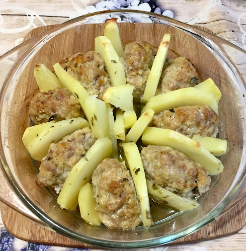 Prendete adesso una pirofila, ungetela di olio e sistemate le polpette alternandole alle fette di patate. In ultimo date un filo di olio evo e infornate a 180° per 30 minuti circa.