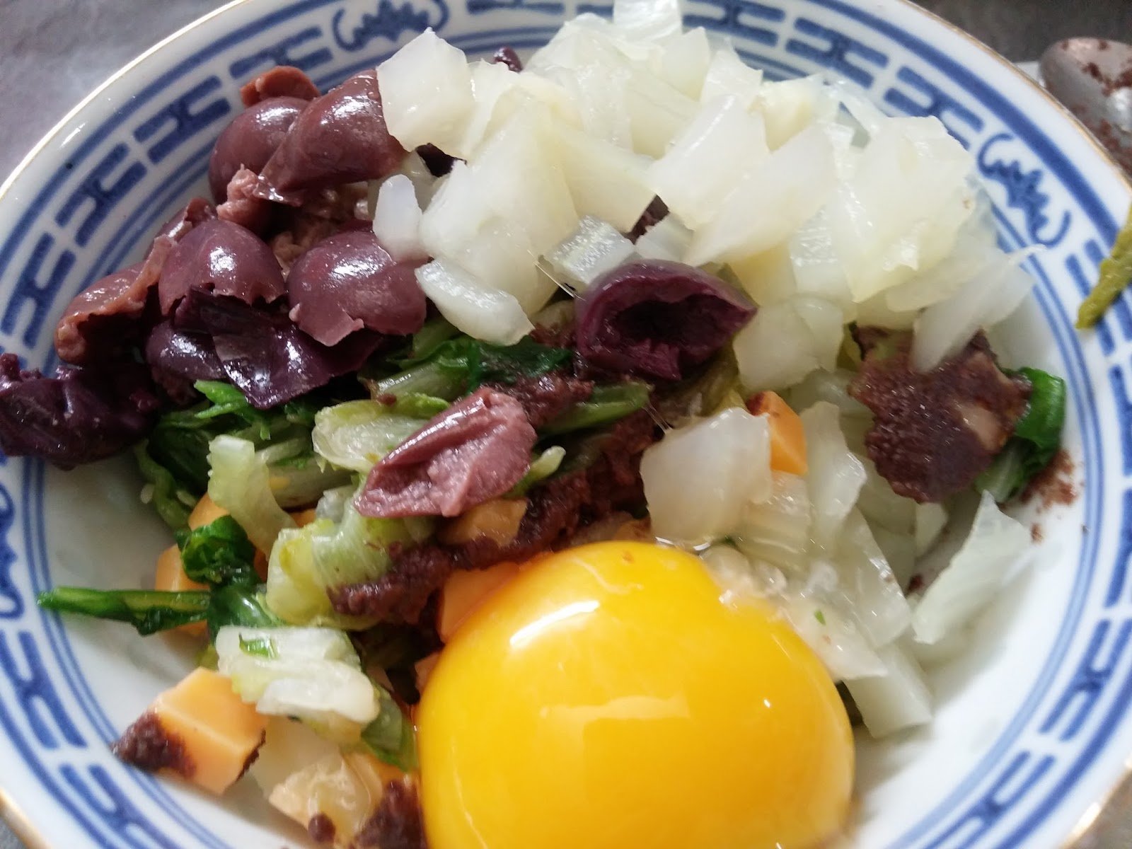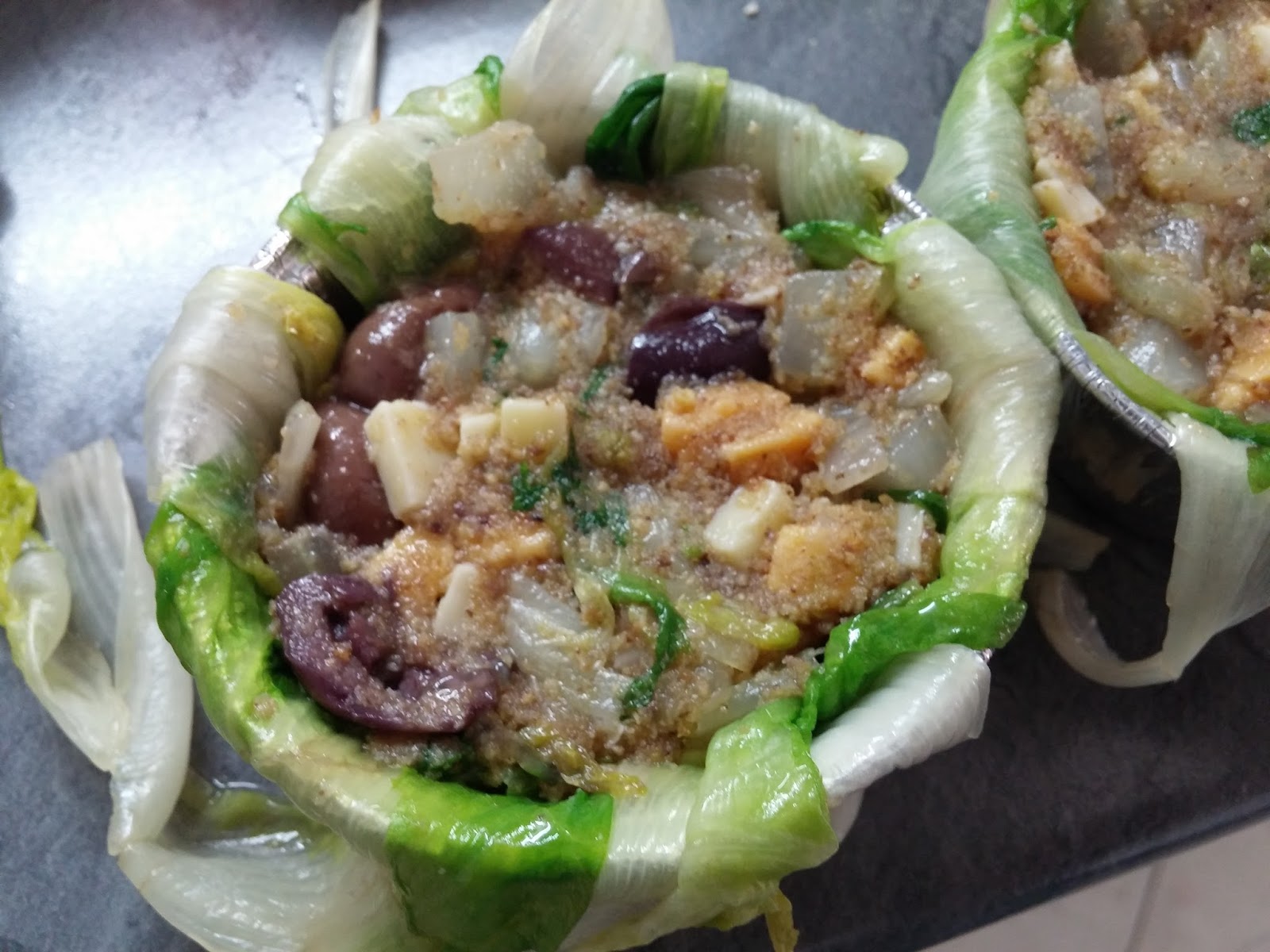 Scarole q.b.( la quantità varia a seconda del tipo di scarola utilizzata); 20g di emmental; 20 g di ceddar; 20g di olive nere denocciolate; 1 cucchiaino di paté di olive nere; 70 g di finocchio; 1 tuorlo; pangrattato q.b.; sale.