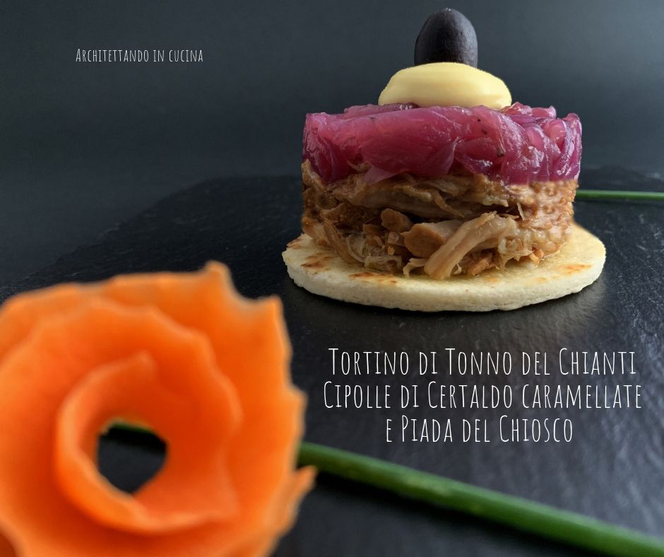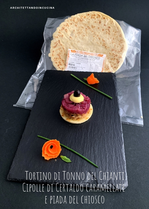 Ormai la piada sta diventando il trend di questa caldissima estate, per la sua versatilità, ma anche perché non parliamo mica di una piadina qualunque, ma di quelle di Fresco Piada, azienda artigianale, che le produce e le cuoce a mano, ad una ad una, le confeziona, così anche io che non sono in Riviera Romagnola, ma nel Chianti, posso gustarmele. Per la ricetta di oggi ho scelto il gusto del Tonno del Chianti (se non sapete cos’è, leggetevi questo post!), con la dolcezza della Cipolla di Certaldo caramellata, composti in un tortino, insaporiti con una maionese allo zenzero fresco e una oliva taggiasca candita e a fare da supporto, la Piada del Chiosco di Fresco Piada, fatta con farina di grano tenero coltivato in Romagna, acqua, olio extra vergine di oliva romagnolo, sale marino integrale di Cervia, lievito e miele, che dona un profumo in più e rende l’impasto più morbido. Questa è una piadina tipica del nord della Romagna, più spessa e più piccola di circonferenza: l’ho scelta proprio per il suo maggior spessore che garantisce al tortino, il giusto sostegno.