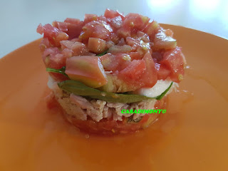 Ho preso un coppapasta e l’ho messo al centro di un piatto, quindi ho alternato uno strato di pomodoro, uno di basilico, mozzarella e tonno, una volta terminato gli strati ho tolto delicatamente il coppapasta e l’ho servito con un goccino di olio