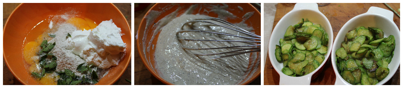 In una ciotola sbattete, le uova con la farina, lo yogurt, foglie di origano, usate il latte per regolare la densità dell’impasto che deve risultare denso come quello per l’impasto di una torta. Aggiustate di sale e pepe. Sistemate le zucchine in due pirofile di circa 20 cm di lunghezza leggermente unte o in una più grande.