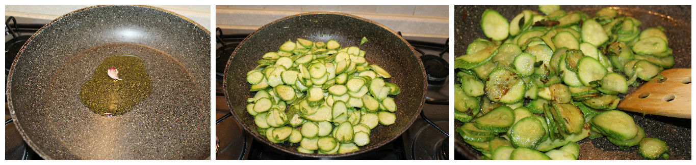 Scaldate l’olio in una padella con lo spicchio d’aglio, aggiungete le zucchine, salate e pepe a piacere, rosolate a fiamma vivace per 10 minuti mescolando spesso.