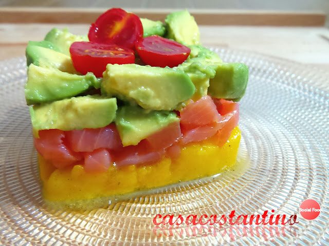 Adagiamo un coppapasta al centro del piatto da portata e riempiamone il fondo col mango quindi continuiamo con i dadini di salmone e completiamo con l’avocado. Decoriamo con qualche pomodorino tagliato a metà.