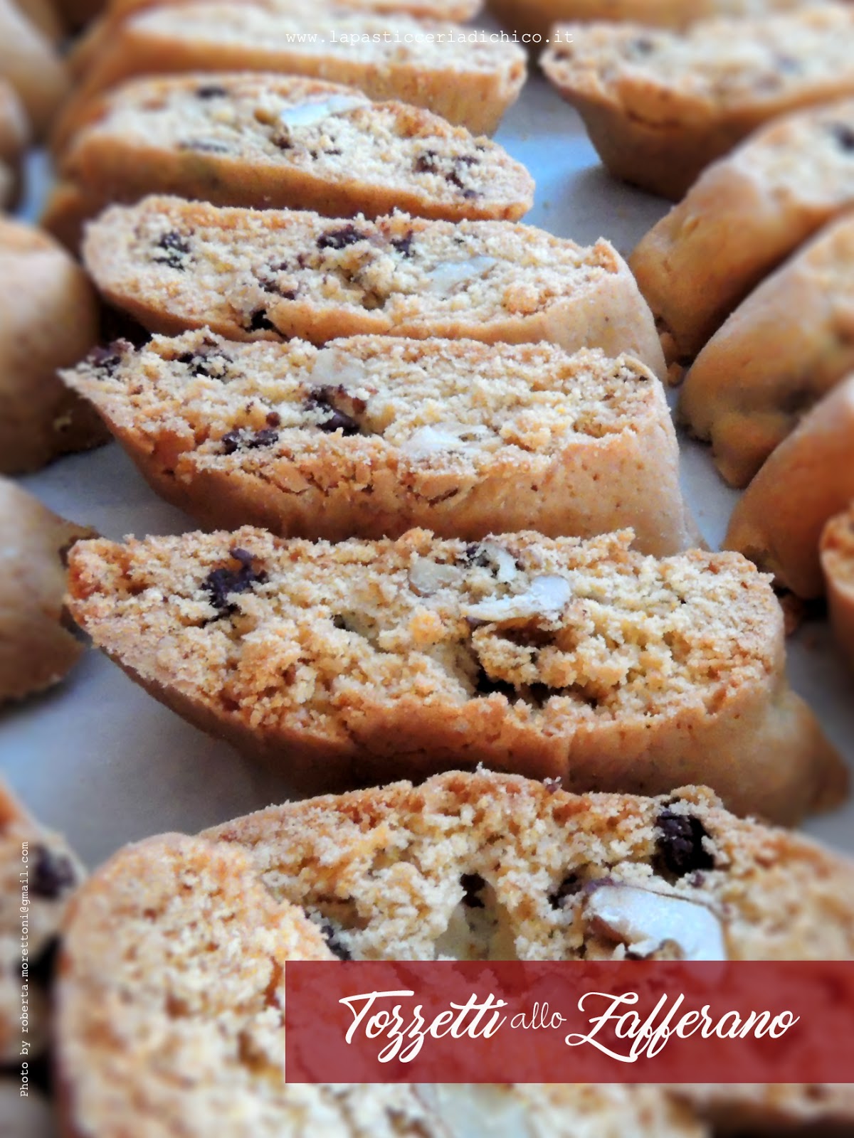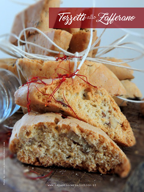 Naturalmente la ricetta tradizionale dei Tozzetti alle Mandorle, non prevede l’uso di Zafferano, quindi io ho rivisitato la ricetta classica, sostituendo le mandorle con le noci, la buccia di limone grattugiata con buccia d’arancia, ho aggiunto gocce di cioccolato, e ho sostituito i semi di anice con lo Zafferano.