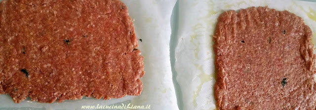Dividere in 2 parti il composto di carne e stendere ognuna in un quadrato tra 2 fogli di carta forno unti di olio. Cospargere il primo quadrato di prosciutto e formaggio, quindi ricoprirlo con il seconod quadrato aiutandosi con la carta forno, sigillare i bordi, cospargere di pangrattato, quindi infornare a 170 ° per 30 minuti.