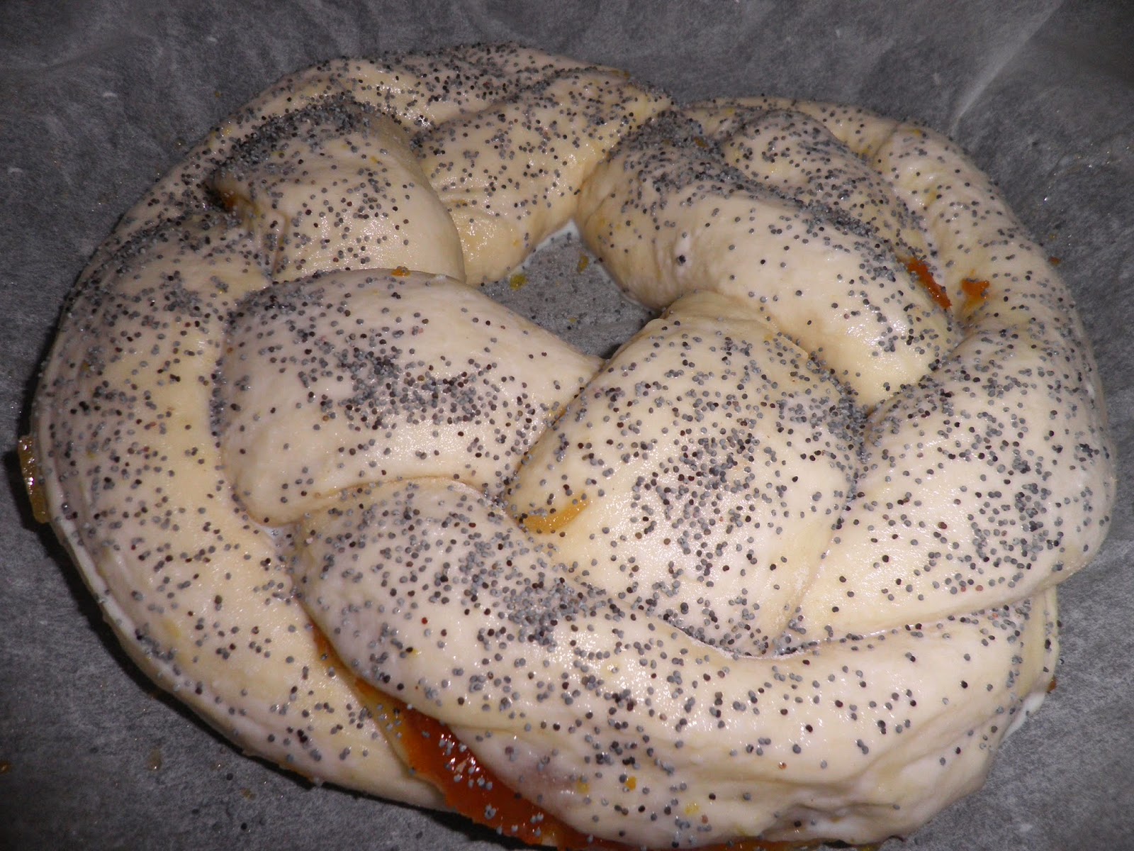Prima di infornare a 180° per 30 minuti, spennello delicatamente la superficie con un tuorlo d’uovo diluito con un po’ di latte e cospargo di semi di papavero.