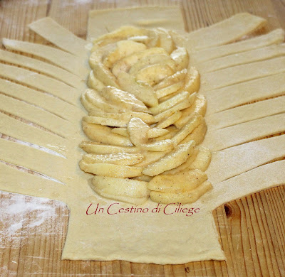 Stendete la prima parte, formate un rettangolo, incidete i bordi e farcite con le mele, come nella foto.