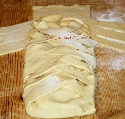 Piegate la parte superiore della sfoglia sopra le mele e proseguite sovrapponendo le strisce di pasta formando così la treccia.