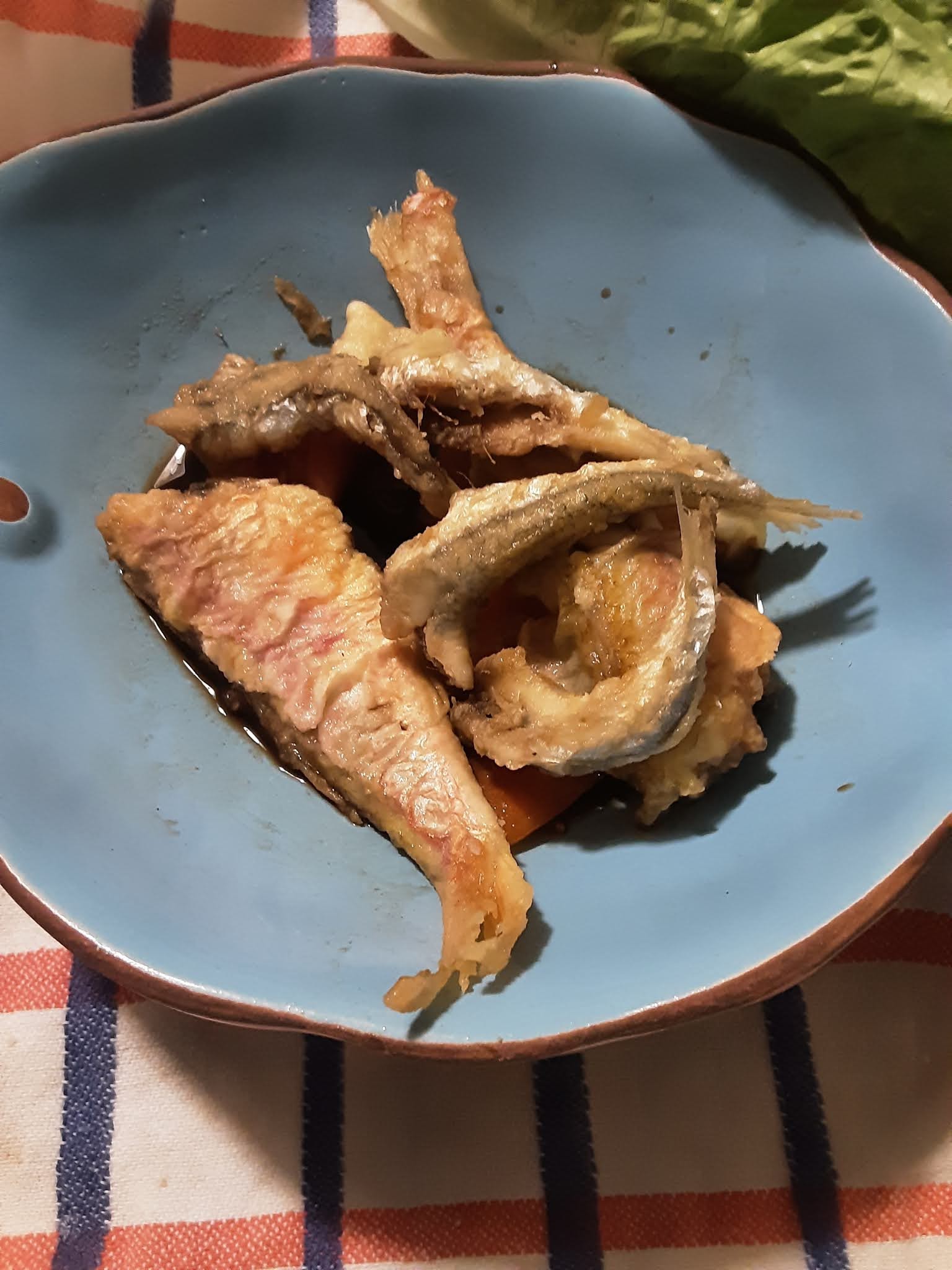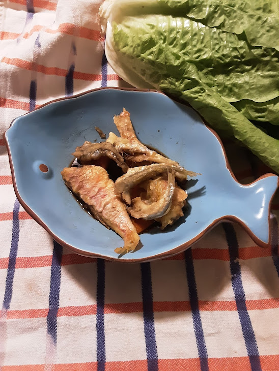 un piatto di pesce fritto con una salsina che rende il sapore di questi pesci speciale