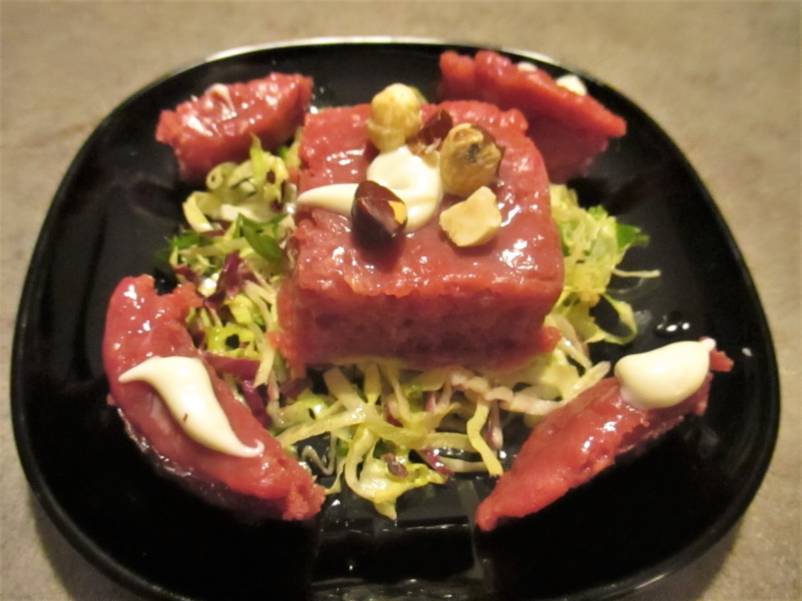 Tritate finemente le nocciole, il prezzemolo, l’aglio e le olive. Salate, pepate, poi trasferite il tutto in una ciotola. Unite la carne tritata, condite con olio e limone quindi amalgamate il tutto e lasciate insaporire per circa mezz’ora.