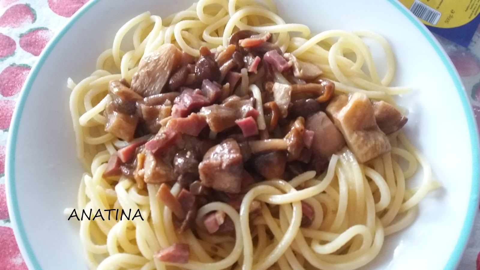 In una padella,olio e aglio ad imbiondire,unire poi speck e funghi,pizzico di sale e pate’ piccante,