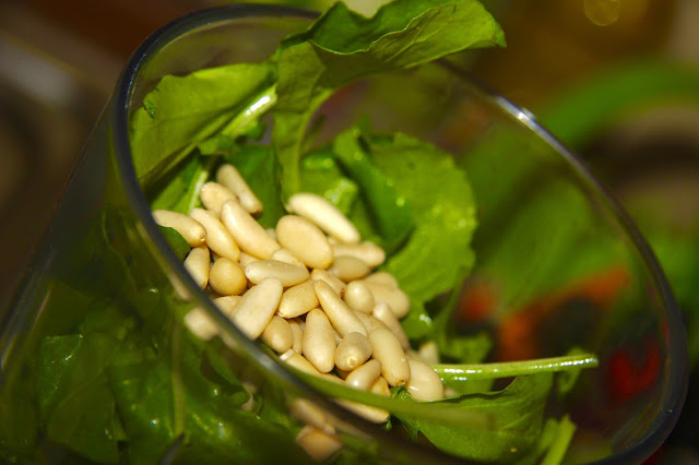 Nel frattempo preparate il pesto. Prendete la rucola, precedentemente lavata e asciugata, ed inseritela in un mixer. Aggiungete i pinoli, il grana e il pecorino e parte dell’olio e iniziate a tritare aggiungendo poco a poco l’olio rimente fino ad ottenere una crema omogenea. Per addolcire il gusto forte della rucola ho aggiunto infine anche un po’ di formaggio cremoso.