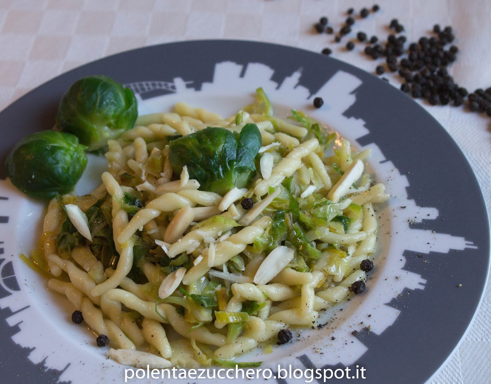 - Preparare sul fuoco un saltapasta o una padella con alcuni cucchiai di olio e quando è caldo versare il porro e rosolarlo un po’, unire quindi i cavolini sminuzzati e rosolare anch’essi per un minuto poi aggiungere un bicchiere di acqua, una bella presa di sale e cuocerli per una decina di minuti. Aggiungere alla fine le mandorle già ridotte a filetti e una generosa presa di pepe nero macinato al momento.