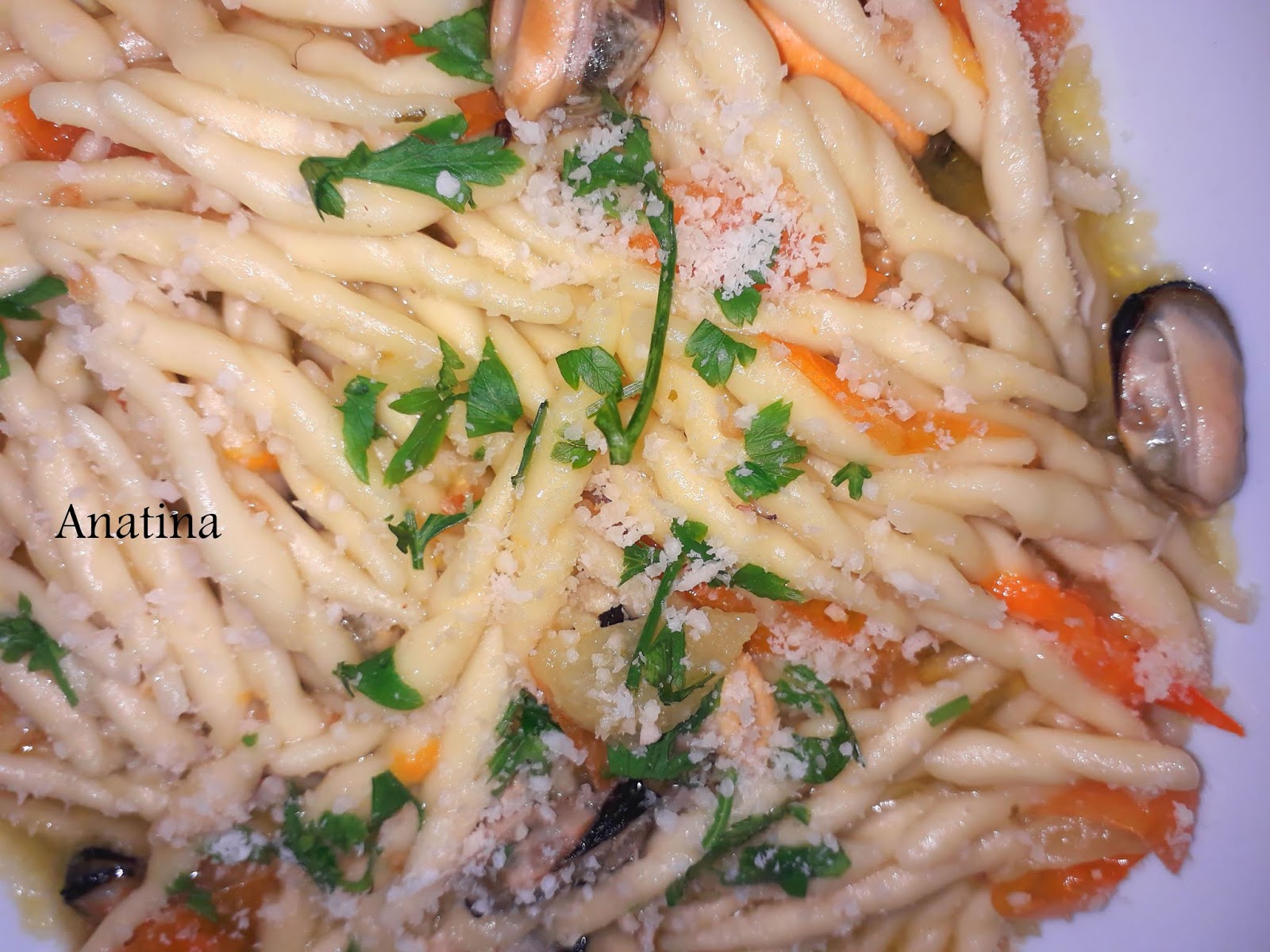 Ora cuocere la pasta al dente ,scolate e versate nel sugo aggiungendo le cozze con la restante