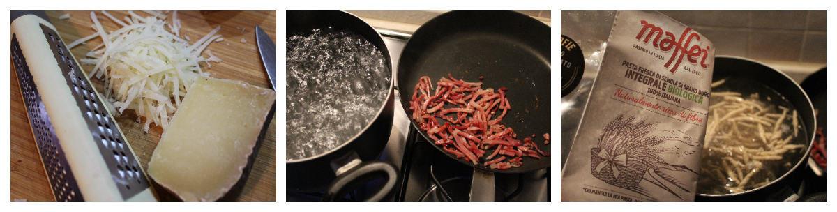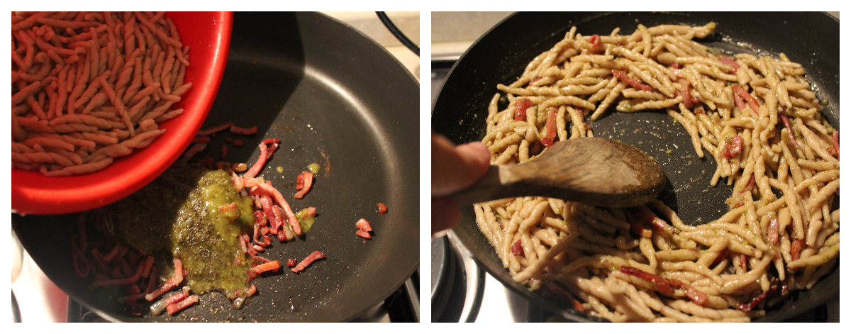 Lessate le trofie per il tempo di cottura indicato sulla confezione, in questo caso 5 minuti. Prima di scolarle prelevate circa mezza tazzina d’acqua di cottura perché vi servirà per mantecare la salsa.