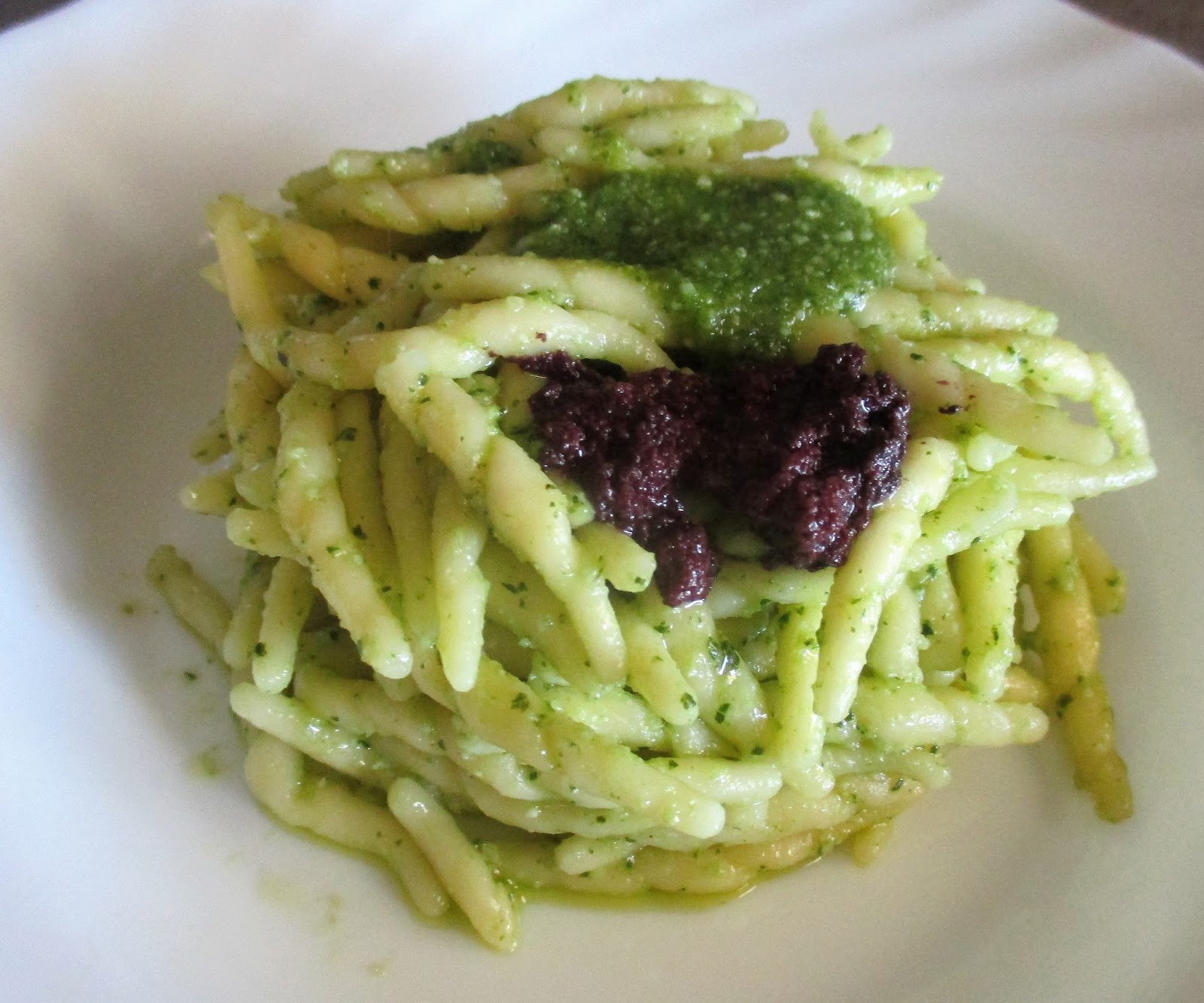 Forte, intensa ma anche delicata questa pasta con questo meraviglioso condimento che richiama alla mente quella magnifica terra chiamata Liguria: pesto di olive nere, pesto di basilico e acciughe.