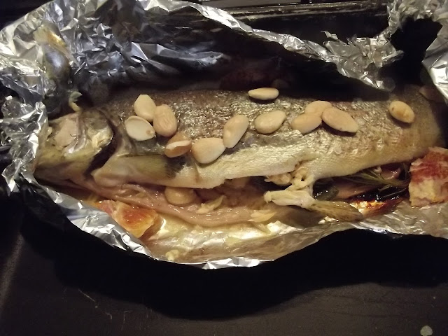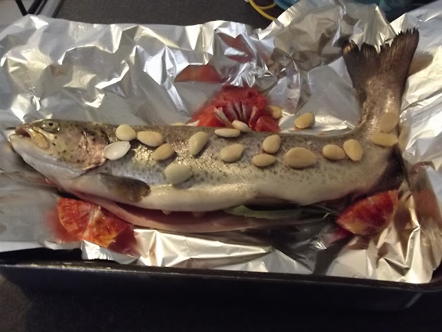 Allargate nella teglia un foglio di alluminio, mettete la trota pulita dalle interiora e all’interno sistemate qualche fettina di arancia, il rosmarino, la salvia, un giro di olio, uno spicchio di aglio e un pizzico di sale, quindi mettete sul foglio ancora dell’arancia e le lamelle di mandorla con un pizzico di sale grosso sul dorso della trota. Chiudete quindi il cartoccio ed infornate a 200 gradi circa per 45/50 minuti.